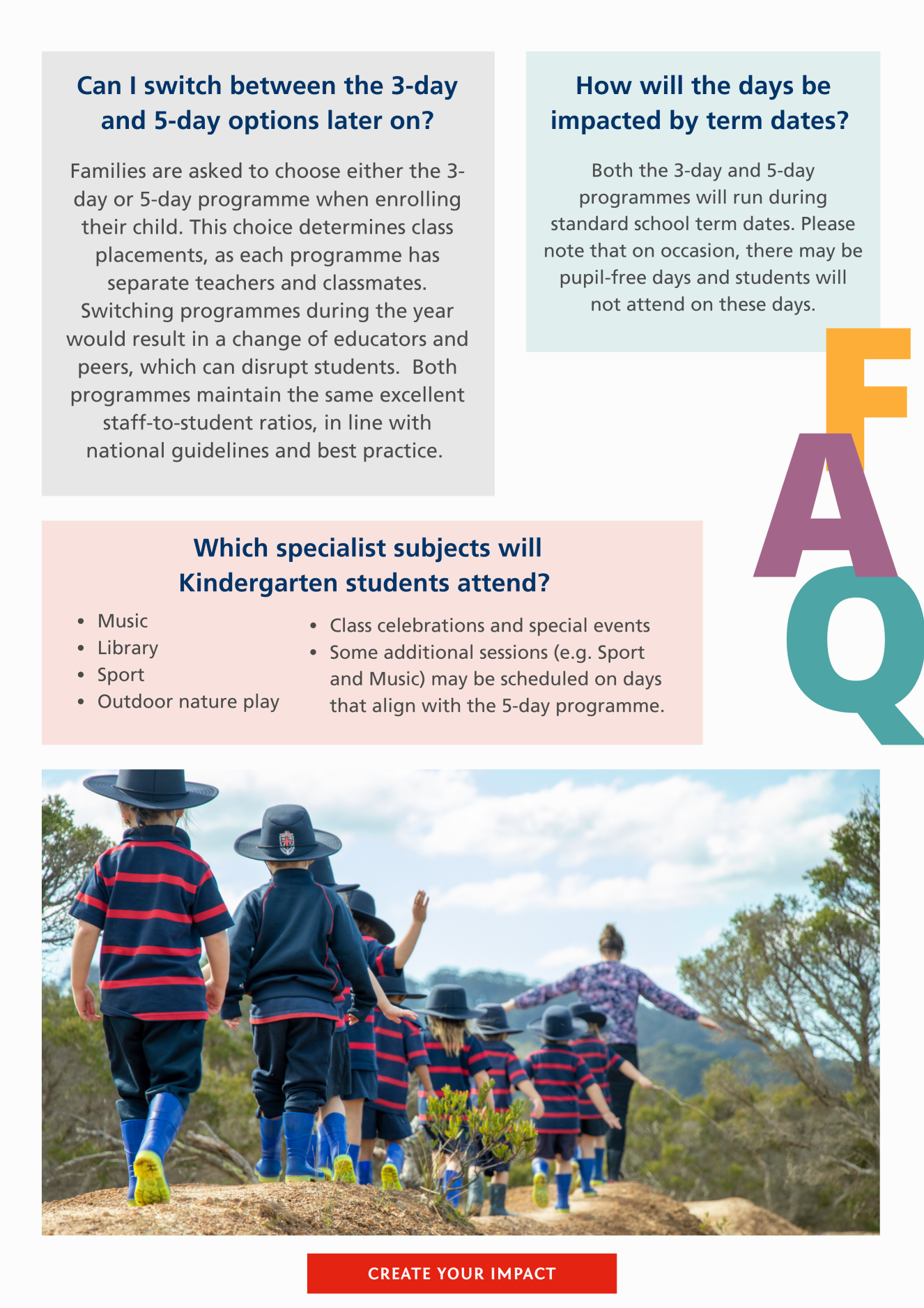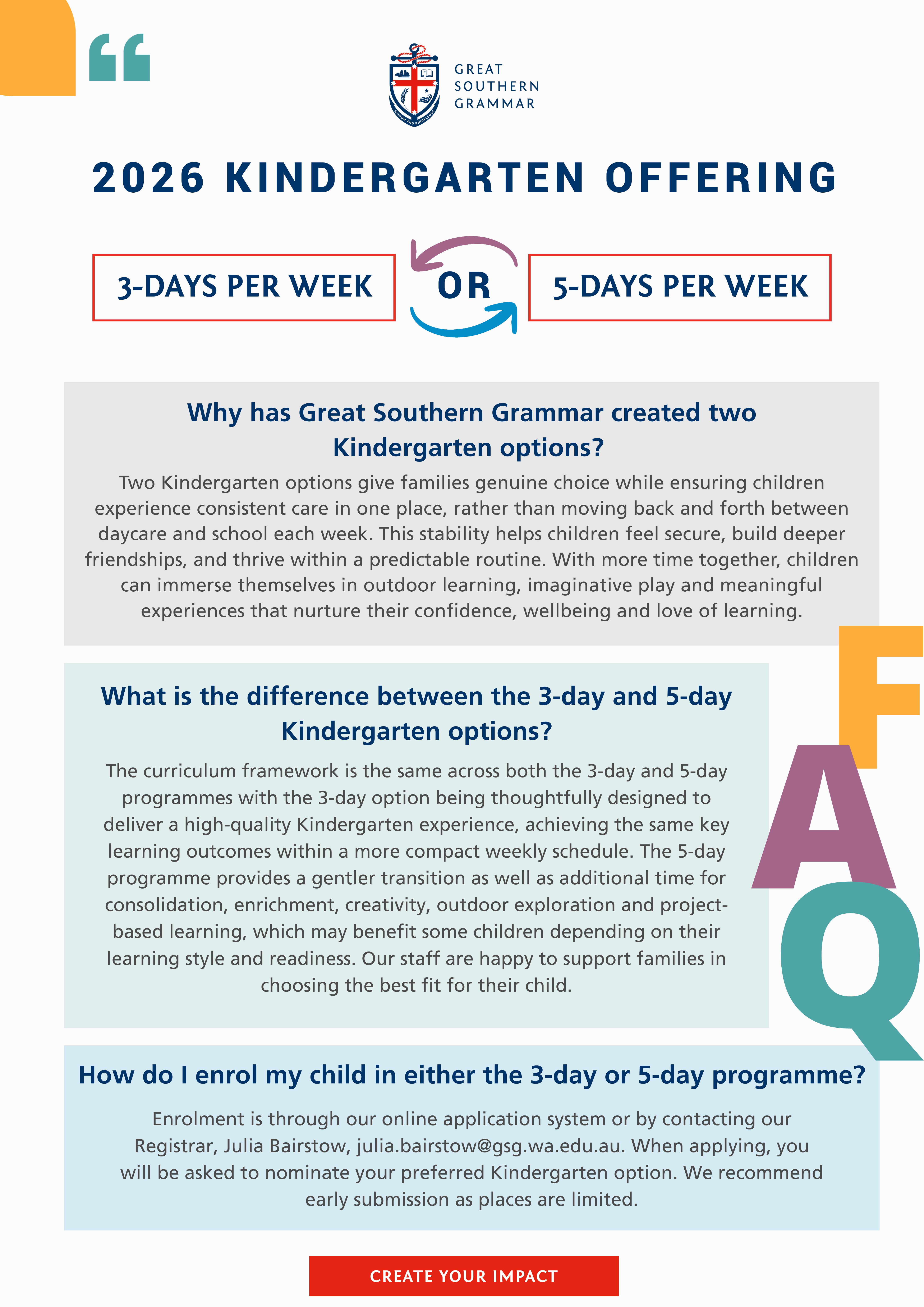 In response to increasing demand and our commitment to offering high-quality Early Years education, Great Southern Grammar will be introducing two Kindergarten programme options from 2026: